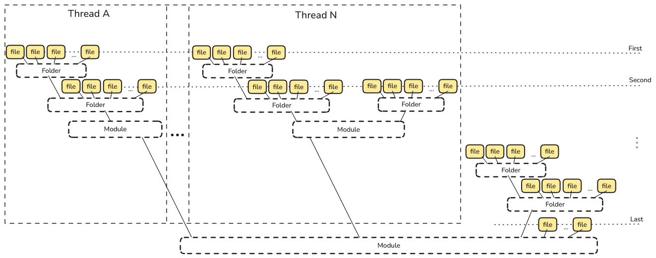The image illustrates a multi-threaded file processing workflow where sub-modules are processed first in parallel across multiple threads. Within each thread, all files in sub-modules and their folders are handled before the parent module’s files are processed. This ensures that processing starts from the deepest level and moves upward, maintaining correct dependency order and maximizing parallel efficiency: